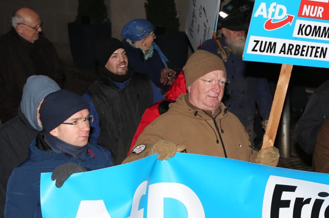 2023-02-03_Friedewald_Stefan_Ginder_Nils_Wilhelm_Hartmut_Kreckel ← Vorheriges Nächstes → Nils Wilhelm am 02.03.2023 am Transparent mit Stefan Ginder, Fraktionsvorsitzender der AfD in Waldeck-Frankenberg (Bild: Nico Kuhn)